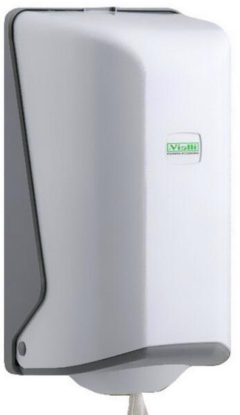 Vialli tekercses kéztörlő adagoló pont adagolással. A papírt egy szűkített nyíláson keresztül lehet kihúzni az adagolóból, ezáltal a perforáció mentén elszakad, így egyszerre csak egy lap kerül a felhasználó kezébe. 14 cm átmérőjű, perforált, belső mag adagolású tekercses kéztörlő papírral használható.
